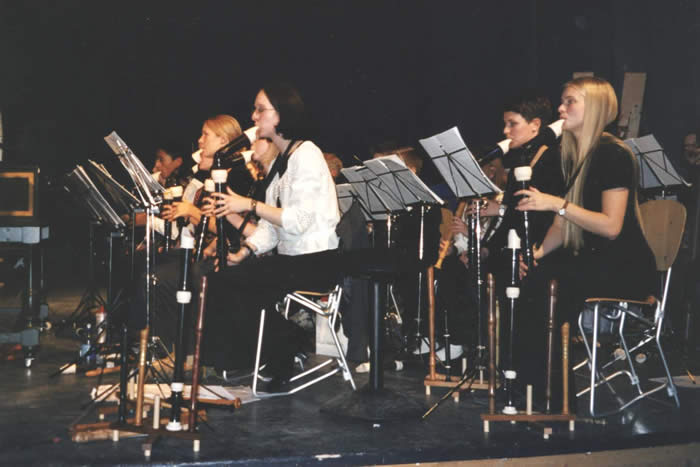 The autumn of 1994 saw the start of the first of many successful projects that Mohn and Skotte organized. Besides classical recorder playing, they wished to focus on Norwegian folk music. Working with Steinar Ofsdal, they put together a unique project with seaflute (the Norwegian variation of a recorder).Ofsdal took part in group practices for the oldest pupils that autumn and Arne Aakre from Vinje in Telemark made the seaflutes for the whole group. In 1995 there was a seminar with Bø Junior Fiddle Group and a concert in Bø. Later there was also a concert in the Munch Museum in Oslo. What was unique with this project was the combined playing of seaflute and hardingfiddle and group playing of seaflutes, something that had hardly been done previously in Norway.